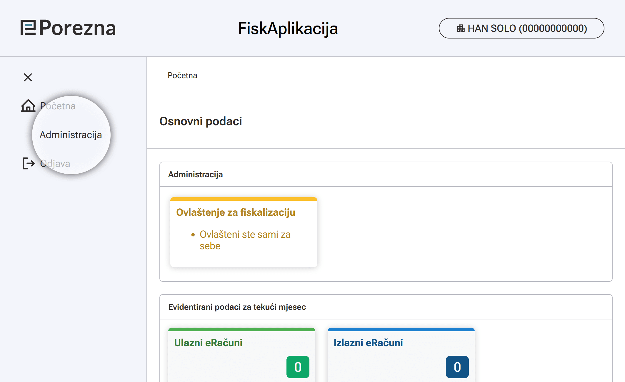 Otvara se novi prozor FiskAplikacija, iz lijevog izbornika klikni na "Administracija".