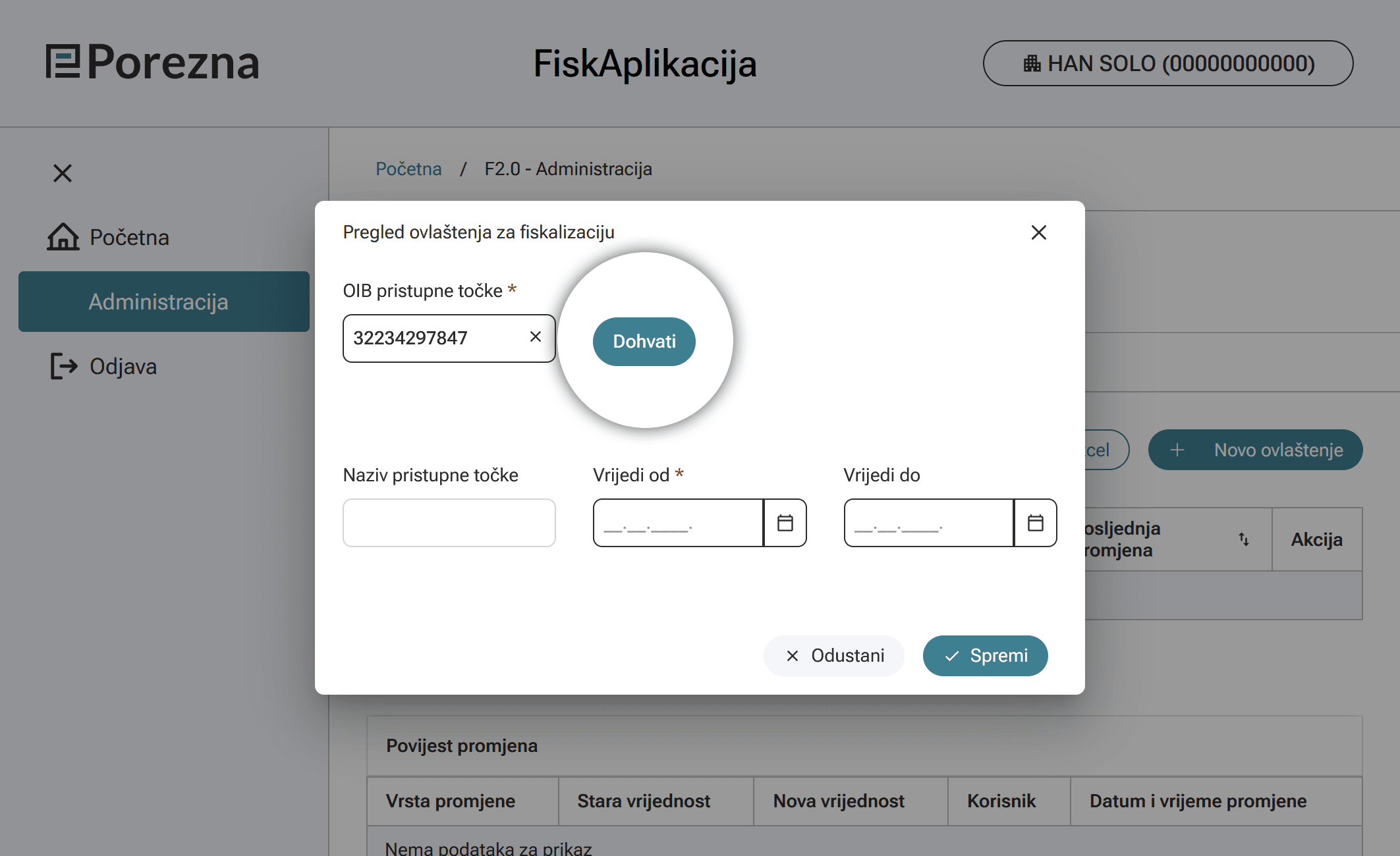 Otvara se prozorčić u kojem pod "OIB pristupne točke" upiši 32234297847 i klikni "Dohvati".